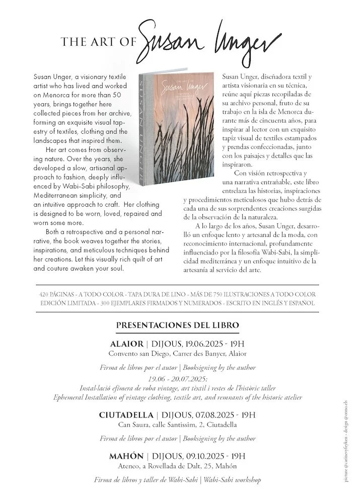 Susan Unger, a visionary textile artist who has lived and worked on Menorca for more than 50 years, brings together here collected pieces from her archive, forming an exquisite visual tapestry of textiles, clothing, and the landscapes that inspired them.
