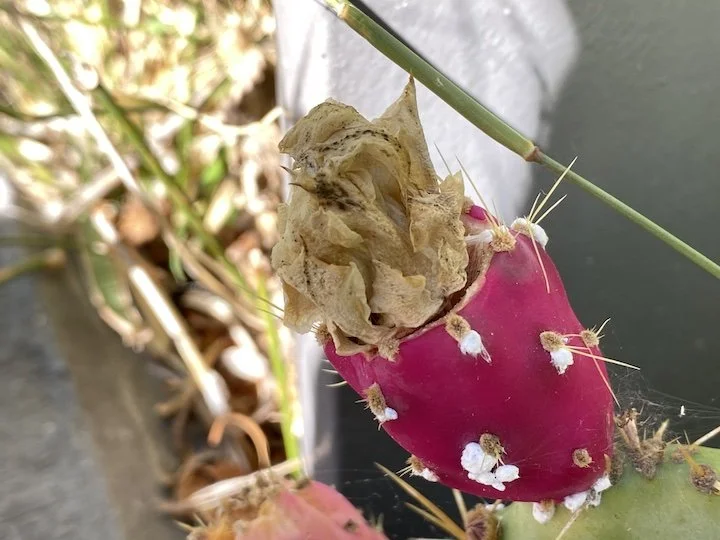 How could we rethink resilience? This plant thrives in an entombed environment, resilient, stubborn, a living agent of resistance. This is ecological agency, where seed and root seek out cracks in the system, sending down roots that work to regenerate soil and engage in nutrient exchange. Both the river and the plant have become marginalized within their own natural habitats. The cochineal insect lives on nopal, prickly pear cactus. Highly prized as a source of deep red (carmine) dye and driving the frenzy of imperialist-colonial trade, the plant and the insect grow wild in the harsh conditions along our river bed.